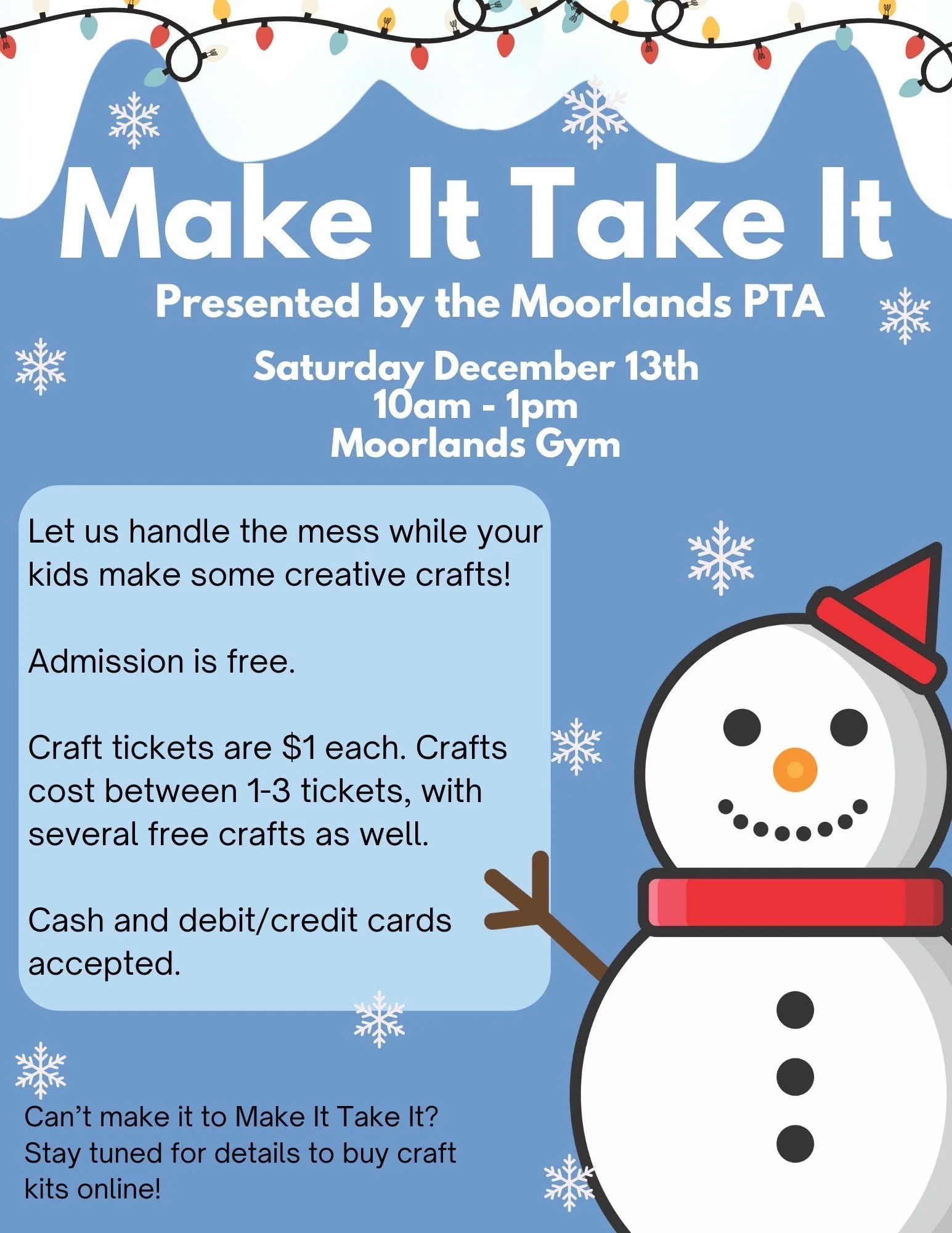 /Join us on Saturday, December 13th, from 10am to 1pm in the Moorlands Gym. Your kids can make fun crafts to give as gifts or to keep for themselves! Admission is free. Craft tickets cost $1 each, with crafts requiring 1-3 tickets, and several free crafts options available as well.